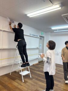 その上にテープでアステールプラザ市民ギャラリーの壁面サイズの枠を作り、中に作品を並べてどれだけの作品が展示できるのかを確認していきます。