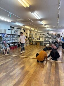 提出されたすべての作品を床に並べて検討するため、朝は全員で綺麗に床を磨きます。