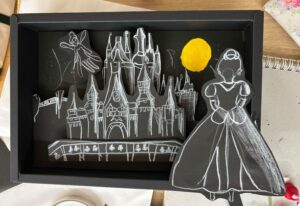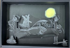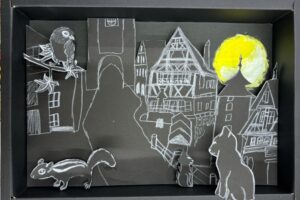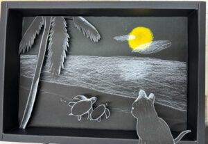 そして手前には、奥行き(空間)を意識して、建物や月を見ている動物などを配置します。