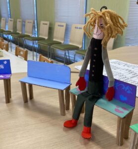 みんなつくった「フリーダ・マリオネット」が休憩するベンチ。