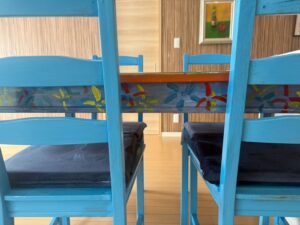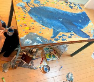Mさんのご家族によると、このダイニングテーブルに絵を描く前は、買い替えの予定だったそう。 廃棄するなら、大きなキャンバスに絵を描くつもりで描いてみよう! というお母さんのアイディアでMさんが描いたら、こんな素晴らしい作品になりました。 もちろん買い替えはキャンセルです。