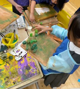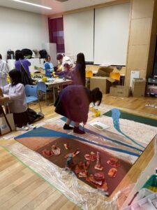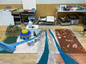 安田小アフタースクール教室ジュニアクラス 共同制作が完成しました! このクラスのみんながつくるのは、中東、イスラエルとパレスチナ。 オリーブ畑は地形から作り、たくさんのオリーブの樹も生えています。