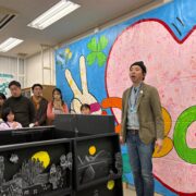 広島に平和の大壁画を制作しようとして志半ばで亡くなった、ニューヨークのグラフィティアーティスト、キースヘリング。彼ならどんな壁画を描いただろうとイメージして、こども達が力を合わせて制作しました。