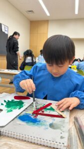 アクリル絵の具、絵筆、ハサミ、ボンド、ペンなど、さまざまな画材に触れながら工作をしました。