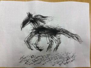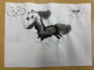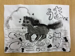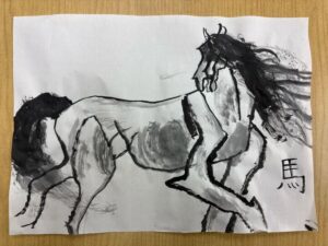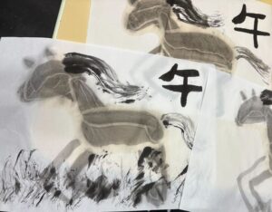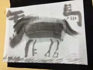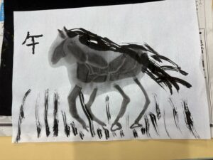 みなさんこんにちは、子どもクラス担当の中島です。 こどもクラスでは今、墨を使った馬の水墨画に挑戦しています。
