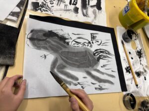 太く長い首、すっと細くなる鼻先、細い脚……。 こうした特徴をしっかり捉えないと、馬らしさがうまく表現できません。 さらに、今回は下描きなしの一発勝負。 全体のバランスを常に意識しながら、慎重に筆を運ぶ必要があります。 そして、多くの子にとって初めての水墨画。 濃い墨、淡墨、紙の白をつかい濃淡をつけていく表現は、いつも使うアクリル絵の具とはまったく異なる難しさがあります。 黒が濃すぎたり薄すぎたり、形がぼやけたり、筆圧が強すぎて紙が破れたり……。 予想外のことがたくさん起きながら、何枚も描くうちに少しずつ扱い方をつかんでいきました。