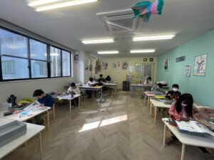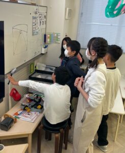 途中、ちょっと算数問題で一息。 生徒から「角度を求める問題を出してみたい」と提案がありました。 正三角形や正方形にはどんな特徴がある? どんなヒントが隠れていて、そこからどうやって角度を導けるかな?