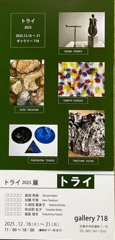 トライ2025展  :日付: 2025年12月16日(火)〜21日(日)  :11時: 11:00〜18:00(最終日は17:00まで)  :丸い画鋲: gallery718  (広島市中区袋町7-18)