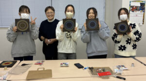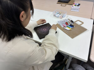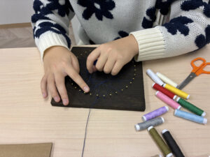 中高生クラスの2025年12月の実習は「ストリングアート実習」 釘に糸を引っ掛けて、不思議な模様を作ります。