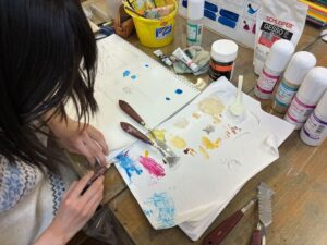 Nさんは筆や各種ペンチングナイフや指などを用いて、どんなテクスチャが生まれるかいろいろと試していました。