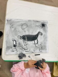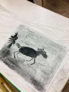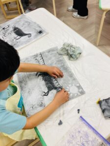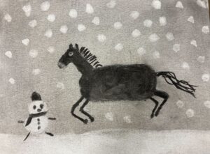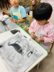 年末のプチクラスでは、画用の木炭を使って干支の「午」を描きました!