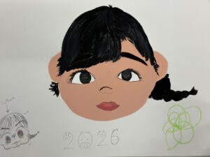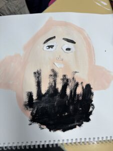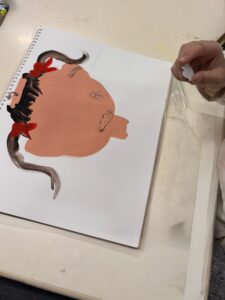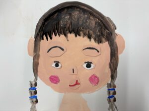 絵の具で顔の形を描いた後、各パーツを大きさのバランスを見ながら制作。