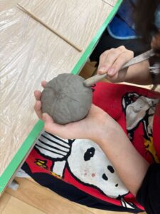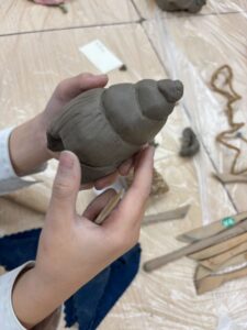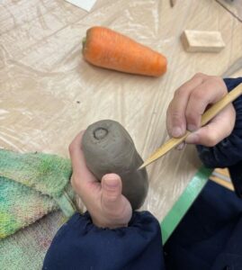 果物や貝殻を選んで、水粘土で模刻(そっくりそのまま作ること)をしました。