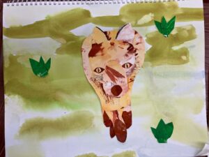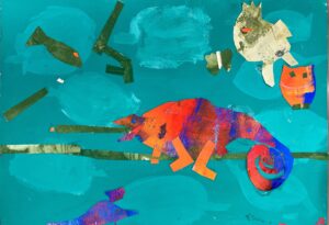 2週目はその色紙を切って貼って、カラフルで美しい生き物の絵をつくります。