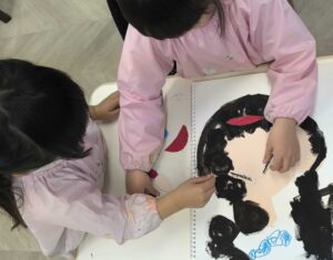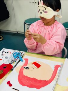 だから絵の具にも「肌色」という決まった色はありません。 色を少しずつ混ぜながら、「これかな?」と自分だけの色を作っていきます。