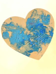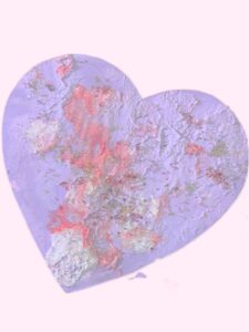 大きなハートの形に、選んだ色を思いきり塗り広げて、混ぜて…… 最後に好きなキラキラを振りかけたら完成!