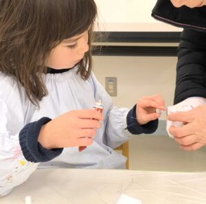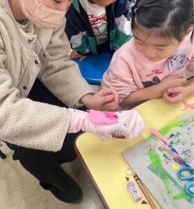 立体的にイメージしやすいよう、お家の方の手に装着してもらい、親子で相談しながら制作。