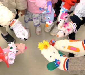 今回は、お家から持ってきてもらった「くつした」を使って、オリジナルパペット作りに挑戦しました