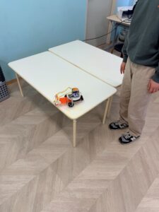 ■センサーを地面に向けて取り付けることで、机の端まで来て落ちそうになったら止まったり、向きを変えて迂回したりするプログラム