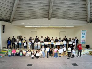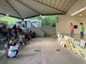 最後に、野外ステージに集まり、完成した作品を並べて講評会をします。