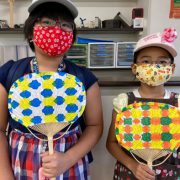 染め紙うちわ 夏にピッタリの手づくりうちわをつくりました。 和紙を折りたたみ、インクにつけると あら不思議...
