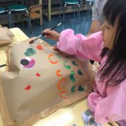 五日市教室プチクラスのレッスンの様子です! いまにも泳ぎそうな「きょだいぎょ」づくり! 大きな紙袋を切ったり絵の具で色を...