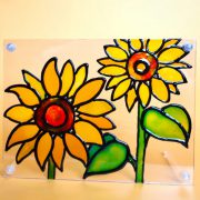 透明なアクリルプレートに、カラフルで透明感のある絵の具で、ステンドグラス風の絵を描きます。