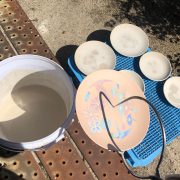 中高生クラスとおとなクラスでは、陶芸絵付実習に取り組みました。 素焼きの皿についた細かい埃