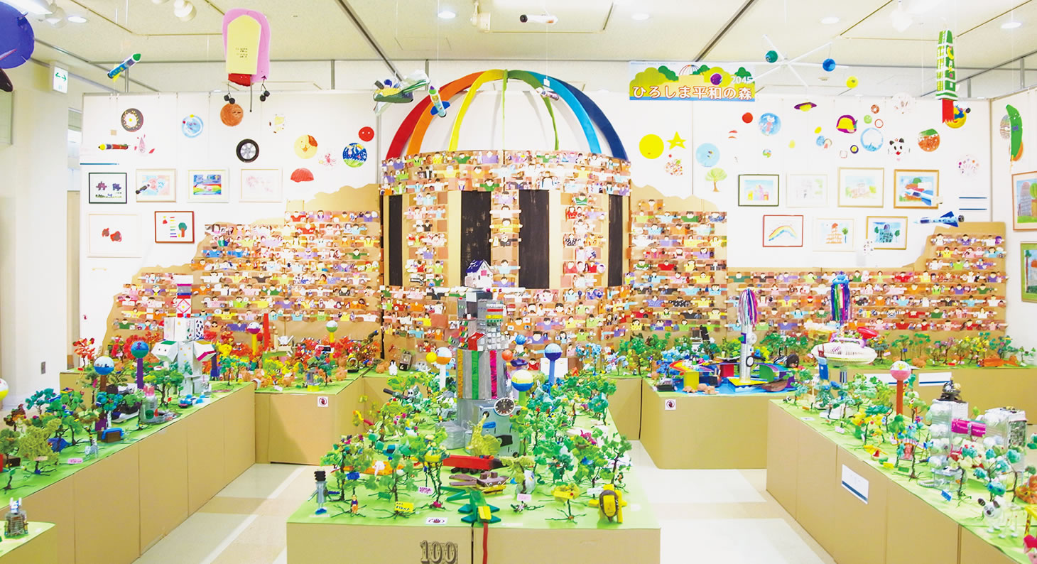 平和をテーマにした絵や工作、動物をモチーフにした絵画、デジタルアート、遊べる立体作品まで、こどもたちの自由な発想とクリエイティビティがあふれています。