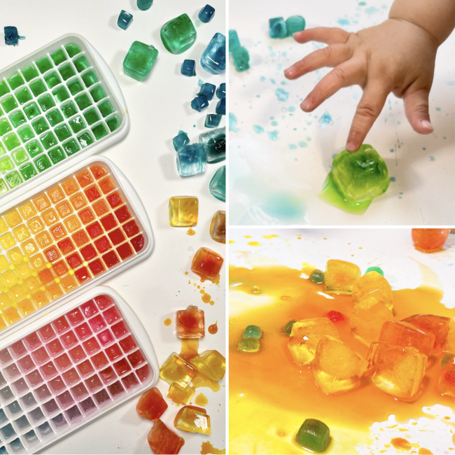 Q.いろこおり あそび年齢:2歳~年中 教室:己斐本校 所要時間:70分 金額:¥3,500(受講料¥1,600/材料費¥1,900) 幼児期に育みたい<感触・感覚・色彩>を遊びの中から体験