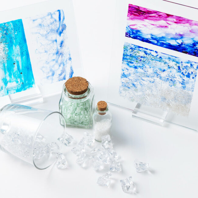 I.クリアテクスチャーアート年齢:年長〜おとな 教室:己斐本校安芸広島駅前緑井安佐南五日市大塚アステール白島校CLiP HIROSHIMA南宇品呉安田小AS 所要時間:90分 金額:¥4,500(受講料¥2,100/材料費¥2,400) 透明な色や質感が作り出す、美しい光と影も楽しもう。